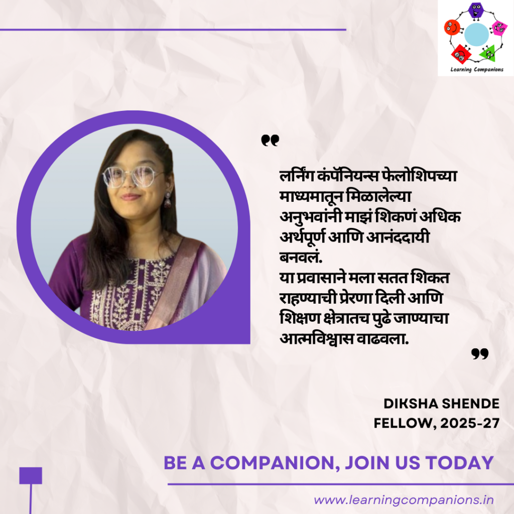 आज या फेलोशिपच्या प्रवासाला सहा महिने पूर्ण झाले असून, आता मला स्पष्टपणे जाणवत आहे की लर्निंग कंपॅनियन्स फेलोशिप मध्ये सहभागी होण्याचा निर्णय हा माझ्या आयुष्यातील एक संस्मरणीय आणि महत्त्वाचा टप्पा ठरला आहे. या प्रवासामुळे मला माझ्या क्षमतांची जाणीव झाली, सतत शिकत राहण्याची प्रेरणा मिळाली आणि शिक्षण क्षेत्रात स्वतःची वाट शोधण्याचा आत्मविश्वास निर्माण झाला आहे.